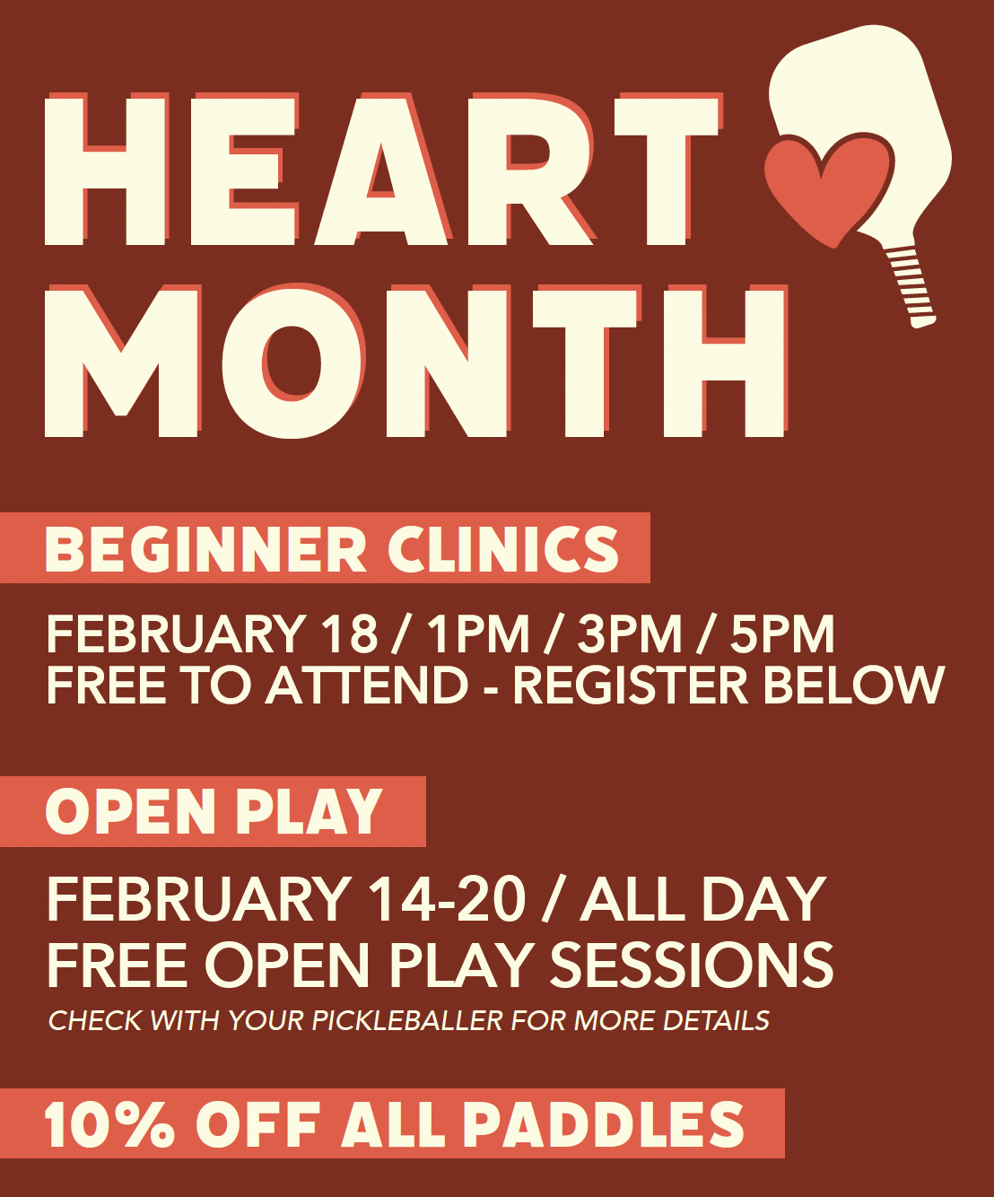 1240 N Greenwich Rd, Wichita, KS 67206In celebration of National Heart Month, Chicken N Pickle is offering FREE open play all day from February 14 – 20, 2022! Check with the CNP pickleball desk for specific times and other details.