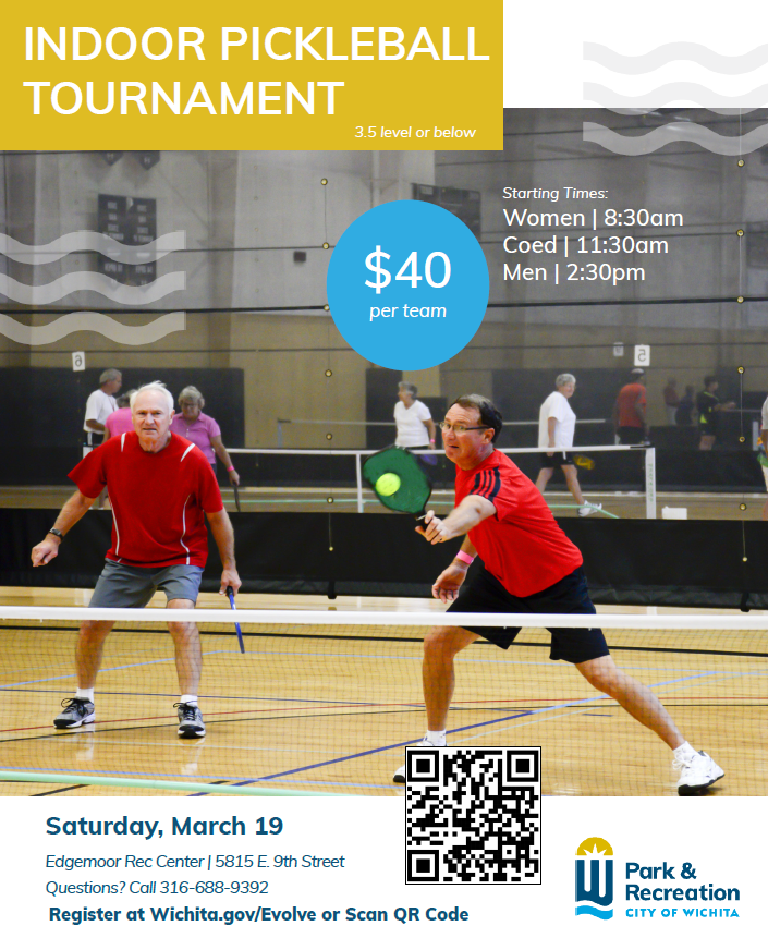 5815 E. 9th St, Wichita, KansasTournament for 3.5 level or below – $40 per team. Register for two divisions and get a discount on registration. Register in person at Edgemoor Rec or by calling (316) 688-9392.