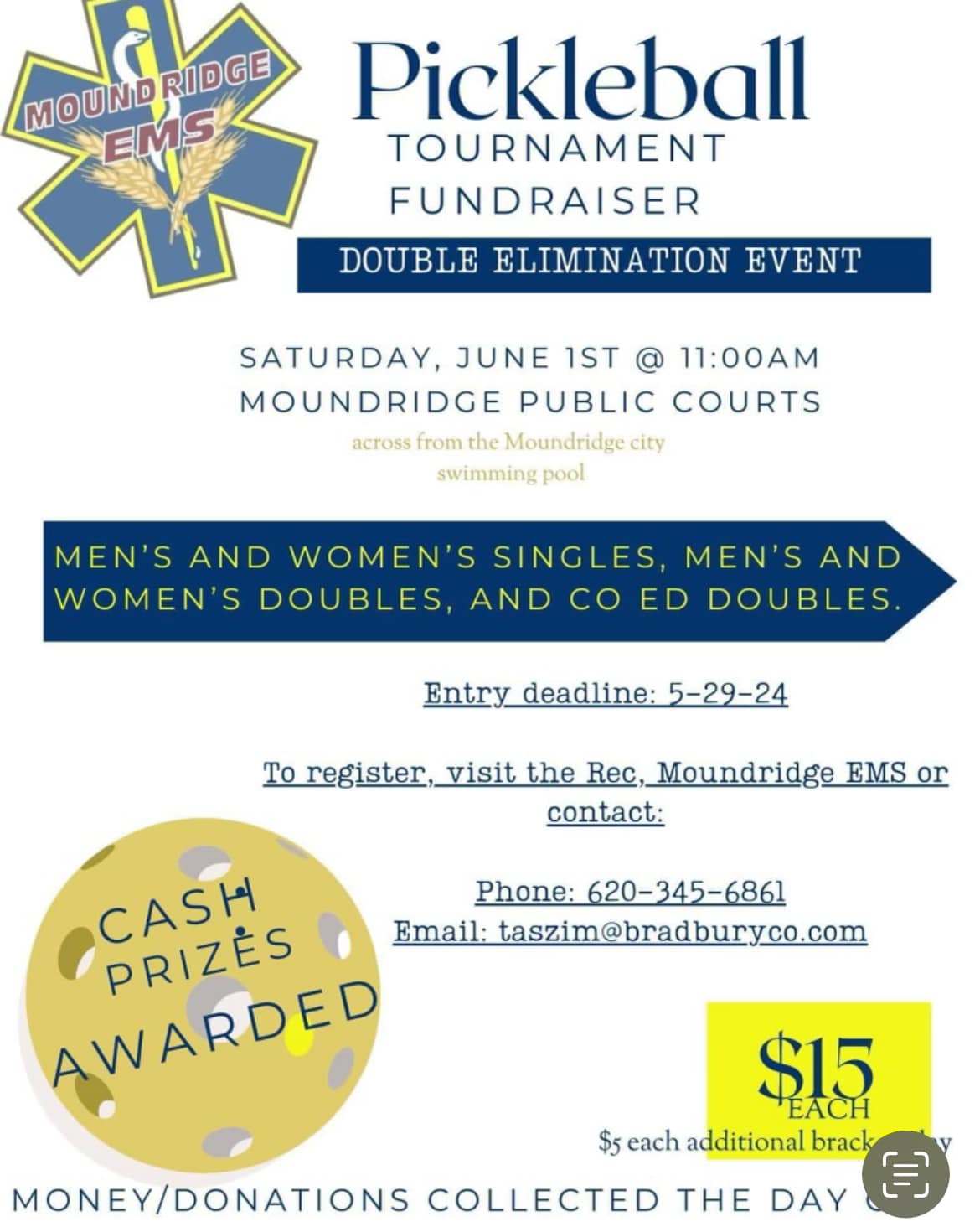 To register, visit Moundridge EMS, email taszim@bradburyco.com, or call (620) 345-6861. $15 entry. Cash prizes awarded.